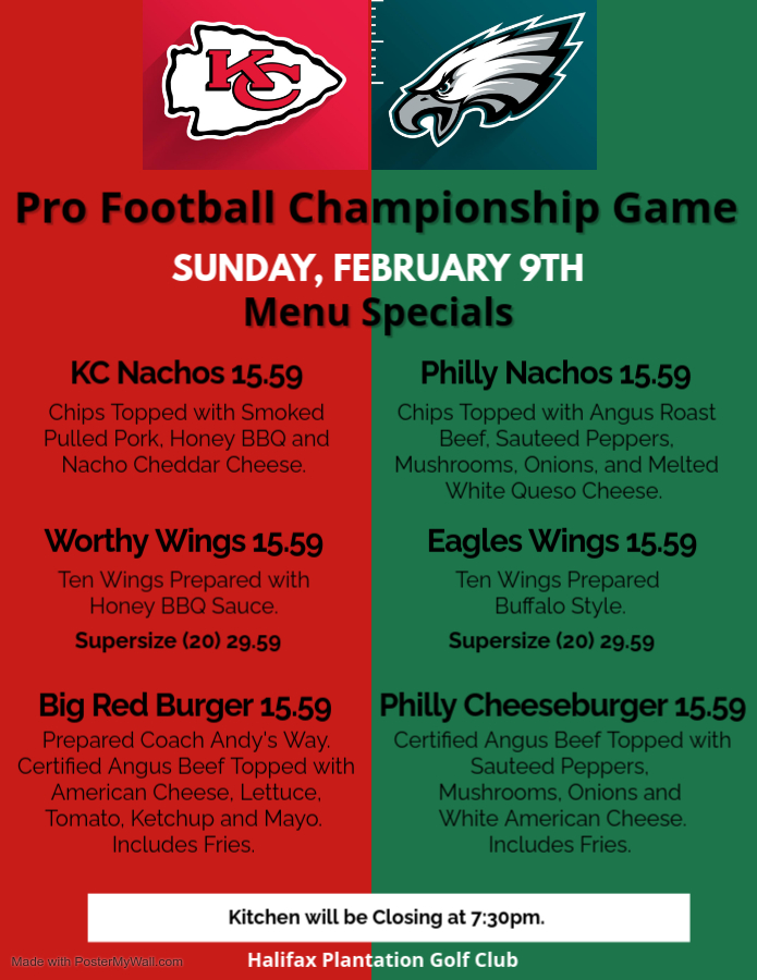 Pro Football Championship Game Food and Drink Specials in the Pub December 19, 2024 by Date: February 9, 2025 Time: 3:00 pm to 8:00 pm