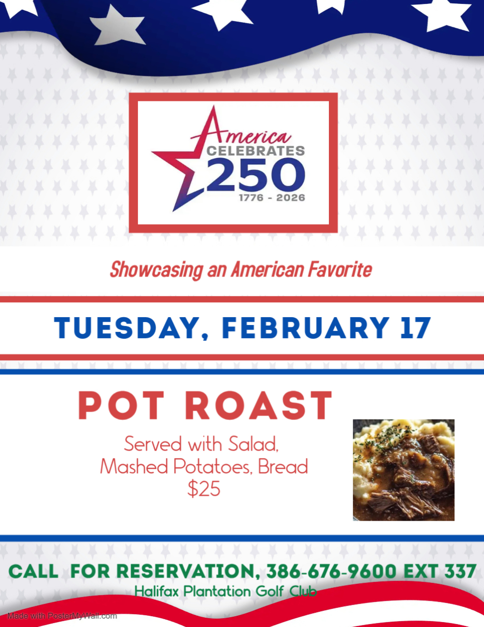 America Celebrates 250th Special – Pot Roast January 30, 2026 by Date: February 17, 2026 Time: 4:00 pm to 8:00 pm