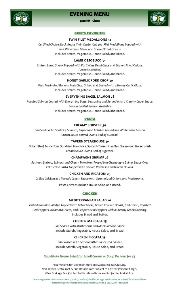 The Tavern is designed for a sit-down dinner with food for any appetite and a wonderful drink menu.